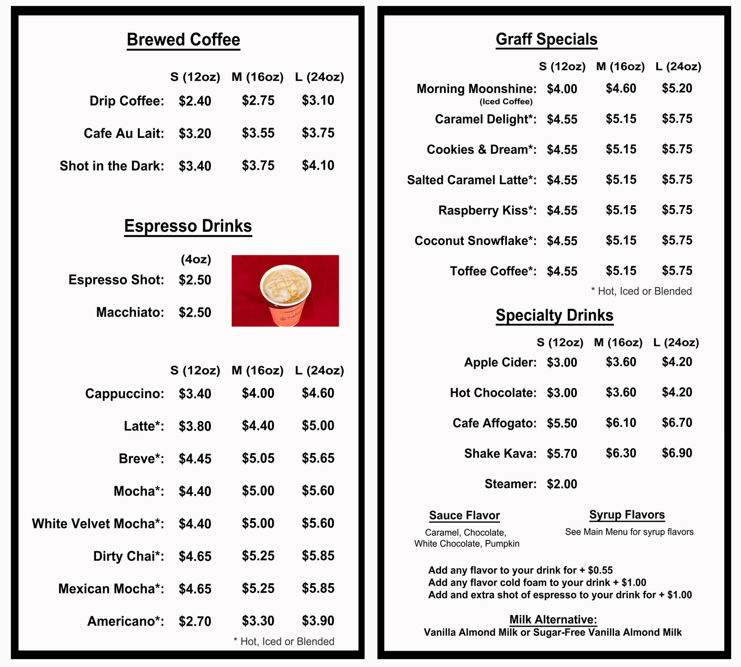 Whether you prefer a hot or cold brew, Graff Dairy has the perfect cup for you. You can choose from various coffee beverages, including: